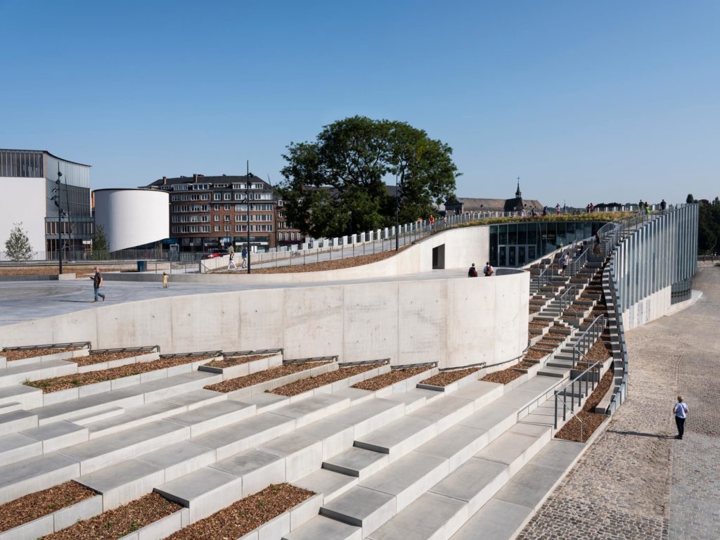 In particular, this article discusses the most recent project, Grognon exhibition space dedicated to the history of digital technologies. The structure’s shape is created by a sequence of organic curves that form one continuous gesture. This establishes a conversation with the surroundings while remaining respectful of the site’s heritage. The landscape-like form allows the historical park to remain on top of the structure, while the roof slopes down to the Meuse River, creating a tiered plaza with wide grassy stairs. This new public square facilitates a variety of activities, eg. urban festivals and street performances, while also providing the city with a new social area. The terraced slope continues with a riverside walkway and a floating platform where musical concerts may be held.